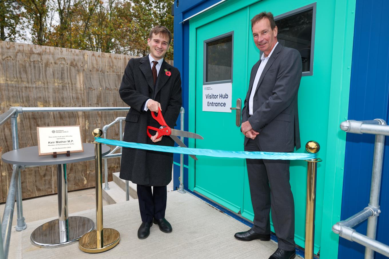 Image: Keir Mather, MP for Selby (left), cutting the ribbon to formally open the Visitor Hub at Wren Hall, alongside the EGL2 Project Director, Neil Lyons (right).